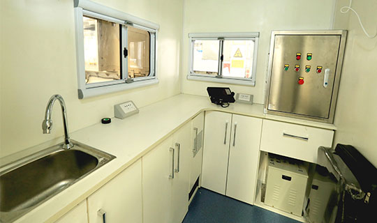 防疫车主要用于对人员集结地、野外医院、伤病员转运站,以及附近居民点等室外环境的细菌和蚊蝇等媒介昆虫进行卫生防疫处理。采用驾驶室与车厢分离的厢式结构:一部分为固定式车厢,作为消杀器械安放和工作人员乘坐之用;另一部分为可开式车厢,装有多用途喷雾机及其附属设